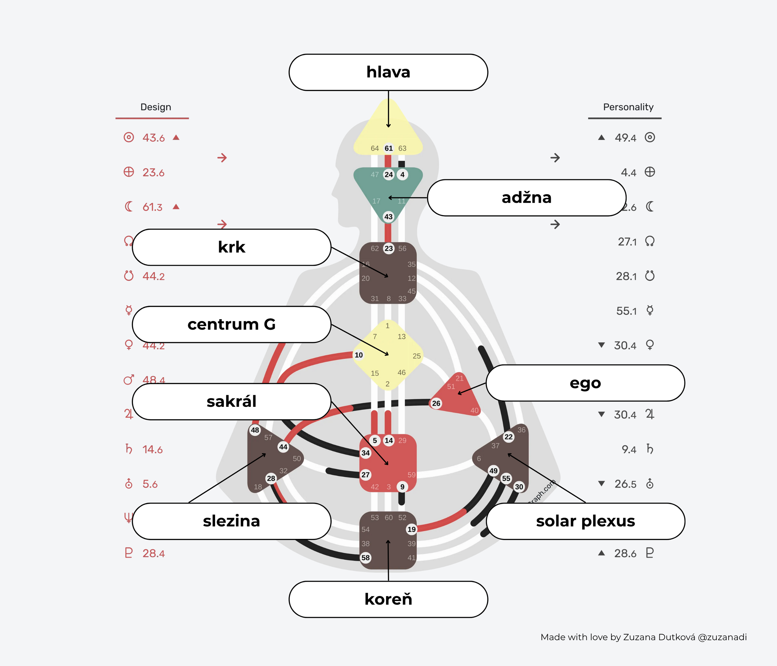 Na výklade sa spolu povenujeme popisu dráh, ktoré ti prepájajú jednotlivé centrá, aby si vedel/a, na čo sa môžeš spoľahnúť. Veľký dôraz na výkladoch kladiem aj na to, aby som ti vysvetlila, akým spôsobom ťa môžu ovplyvňovať v rozhodovaniach tvoje otvorené centrá. Ak chceš vedieť viac o Human Designových výkladoch, ktoré ponúkam, pozri tu.